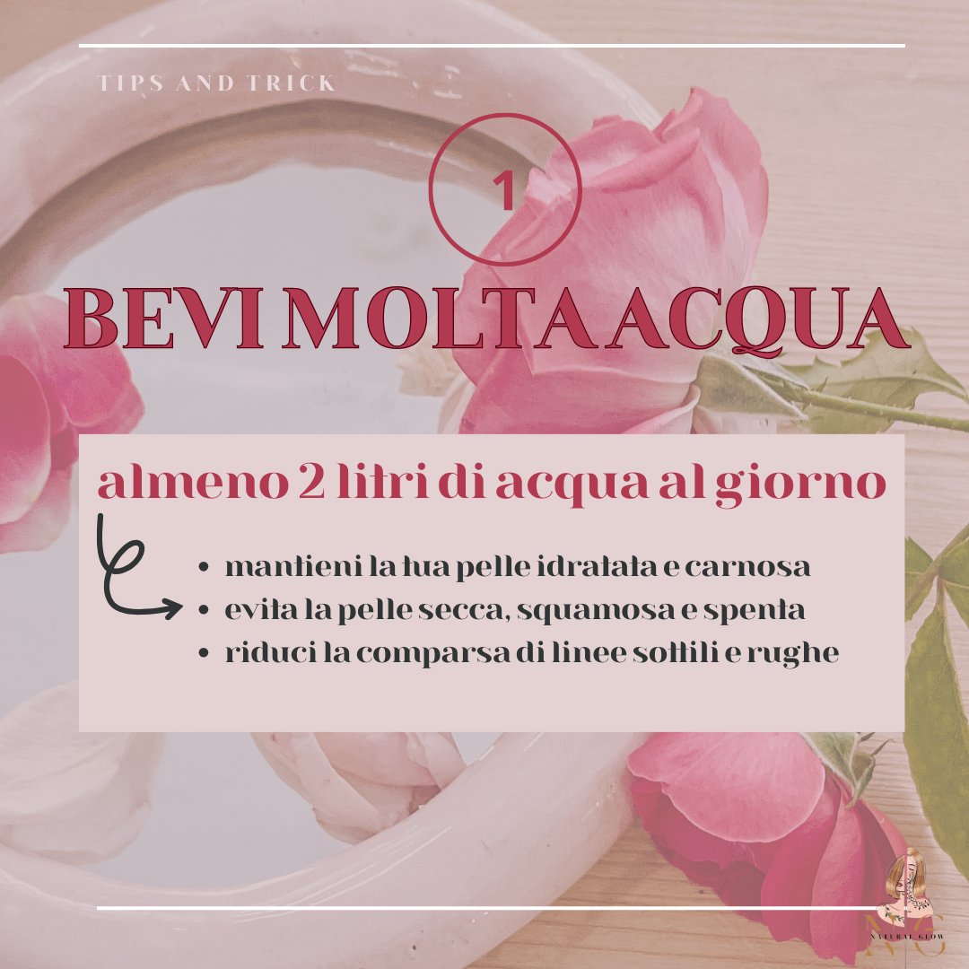 L’idratazione è la chiave per una pelle luminosa. Bevi almeno 8 bicchieri d’acqua al giorno (2 lt) per mantenere la tua pelle idratata e fresca. 🌸✨